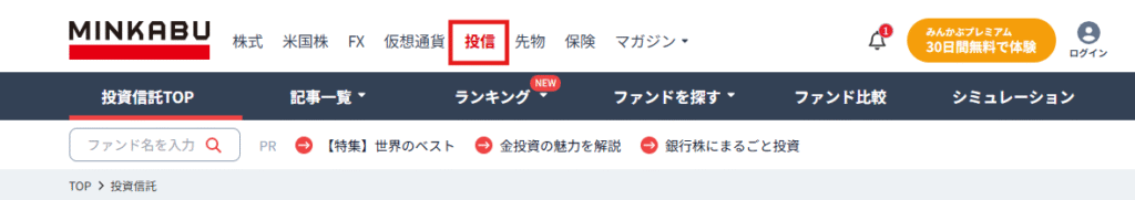 - リンクへ飛んだ後に「投信」をクリック