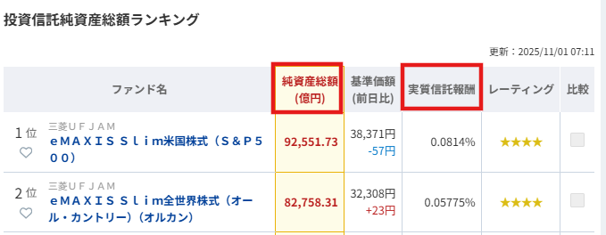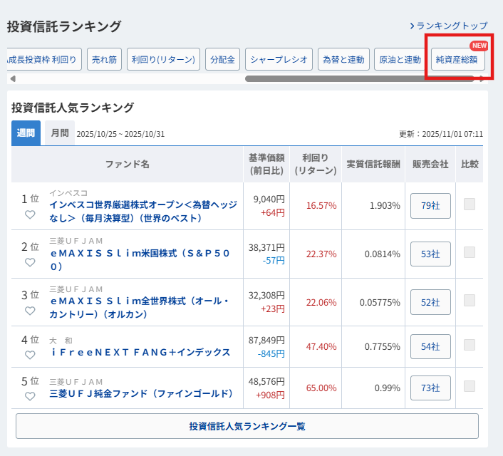 - 「投資信託人気ランキング」の右にある「純資産総額」をクリック