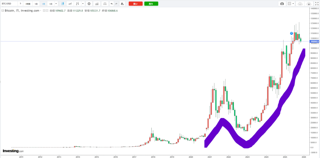 上昇トレンドの中でも急上昇または急下降の期間があります。特に節目(切りのいい数字)の価格や史上最高値を更新したときは調整局面に入る傾向にあります。2025年11月4日で上昇トレンド中の調整局面です。もし購入するのであれば長期保有で、ドルコスト投資法がベストと考えます。